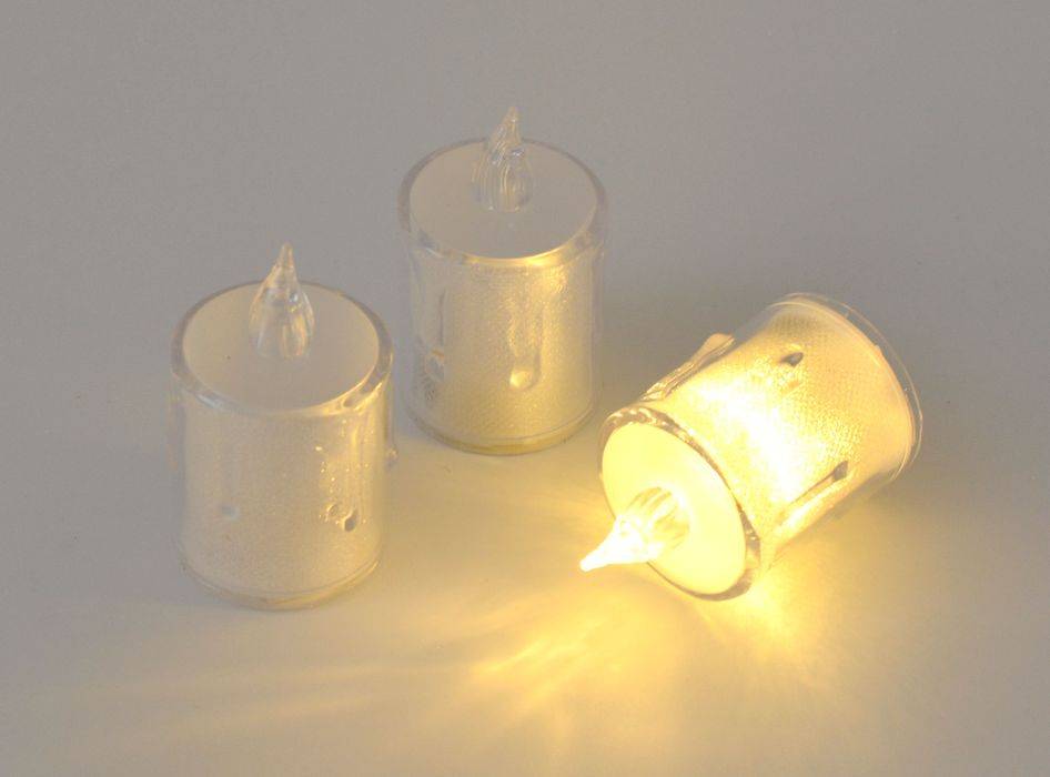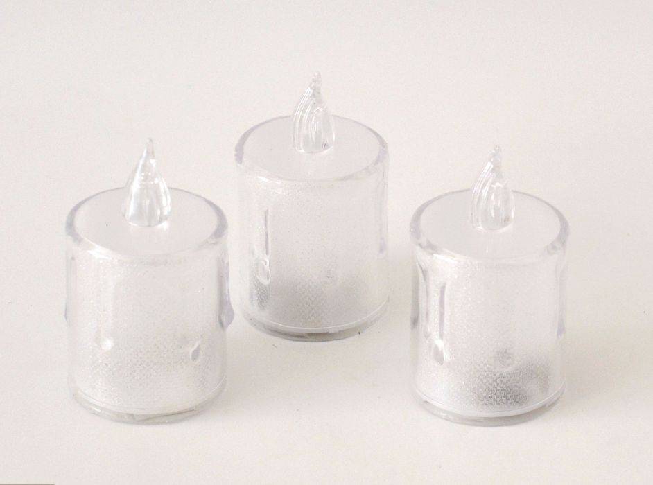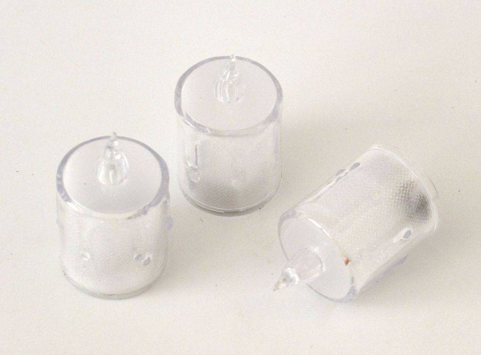 ČAJOVÁ SVÍČKA na baterie vhodná do dekorací a bezpečná do interiéru. Využijete ji k jakýmkoliv příležitostem. Nebliká, pouze svítí studeným bílým světlem. Průměr 3,6 cm, výška 6,2 cm. Napájení třemi bateriemi LR1130, které jsou součástí balení.