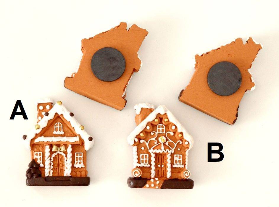 Dekorační malované magnety z umělého kamene. Rozměry domečku 4,5 x 6 cm. Tloušťka cca 13 mm. Na zadní straně nalepený magnet o prům. 24 mm. Dva druhy. Cena za 1 ks.