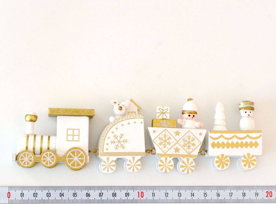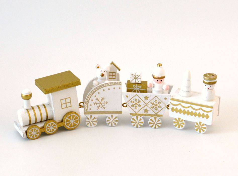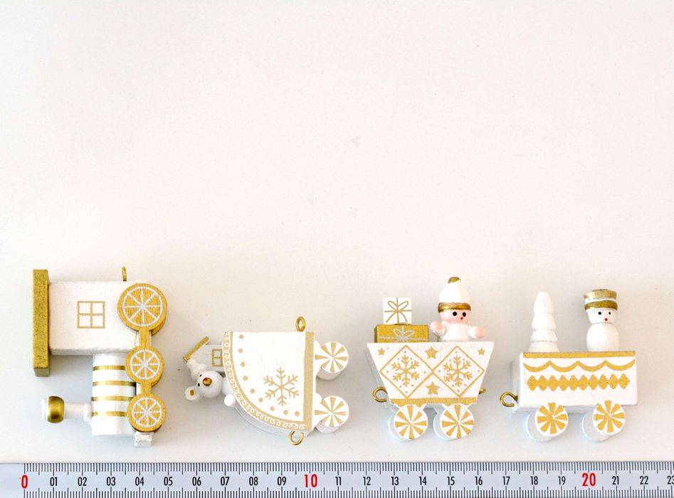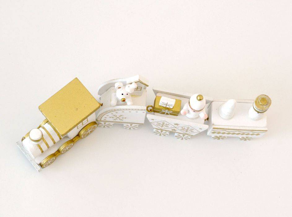 Dřevěná vánoční dekorace červeného vláčku. Barva bílá/zlatá. Vhodná pro vánoční dekorace, aranžování, ... Vláček je spojený kovovými háčky a lze ho rozdělit na jednotlivé části a různě minit pořadí vagonků. Rozměry cca 2,7 x 4,5 x 20,5 cm.