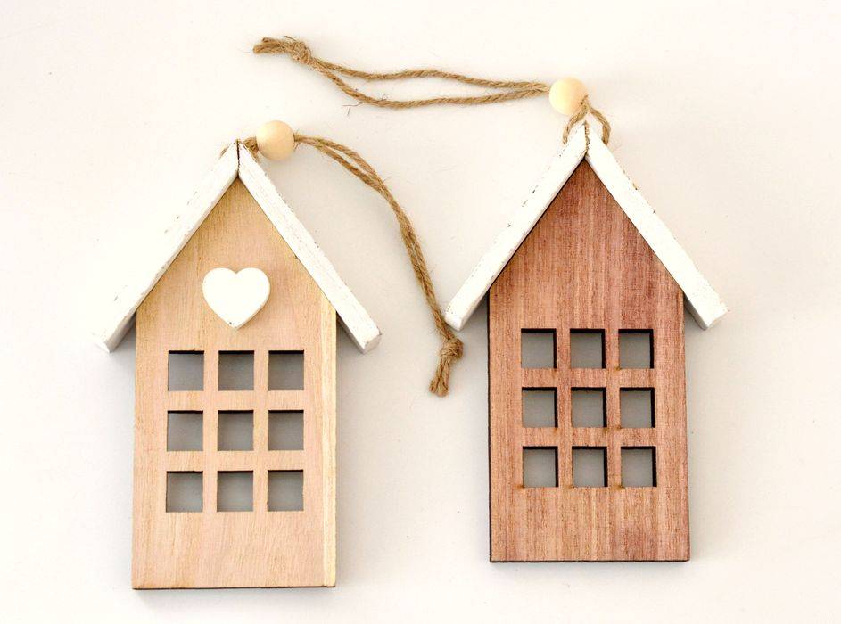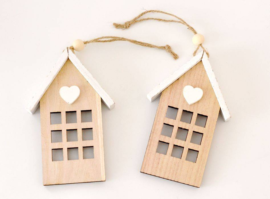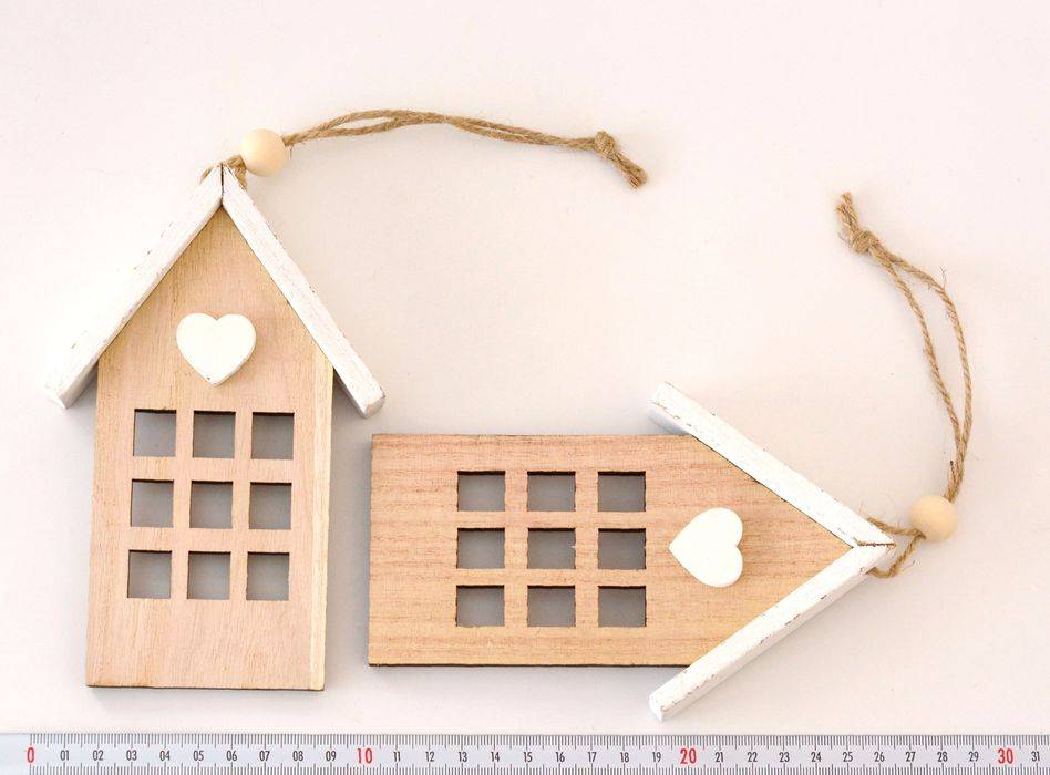 Dřevěná dekorace 2D domku k zavěšení. Rozměry domečku cca 10,3 x 16,2 x 2,3 cm. Délka jutového provázku cca 15 cm. Barva bílo-hnědá. Cena za 1 ks.