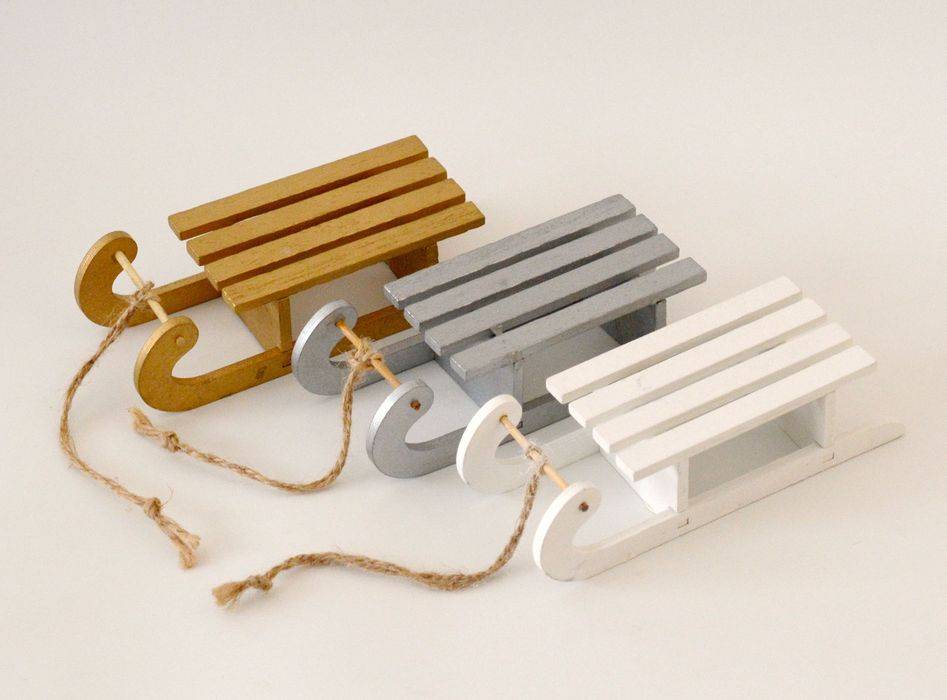 Dřevěná dekorace v podobě sáněk pro dekorace a zdobení.Vyrobené z 5 mm překližky. Barva bílá, stříbrná a zlatá. Rozměr 15 x 5,5 x 4 cm. Cena za 1 ks.