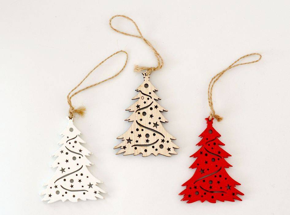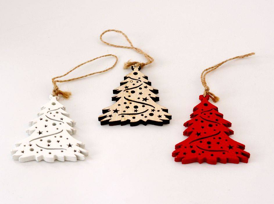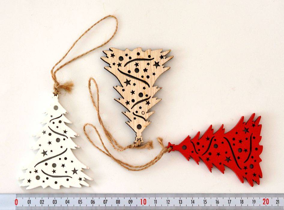 Dřevěná dekorace stromečku vyrobeného z dřevěné překližky 5 mm. Vhodné k aranžování, celoročním i vánočním dekoracím, ozdobení přáníček, dárků a pod. Včetně jutového provázku o délce 9 cm. Rozměry 6 x 8 cm. Barva bílá, přírodní a červená. Cena za 1 ks.