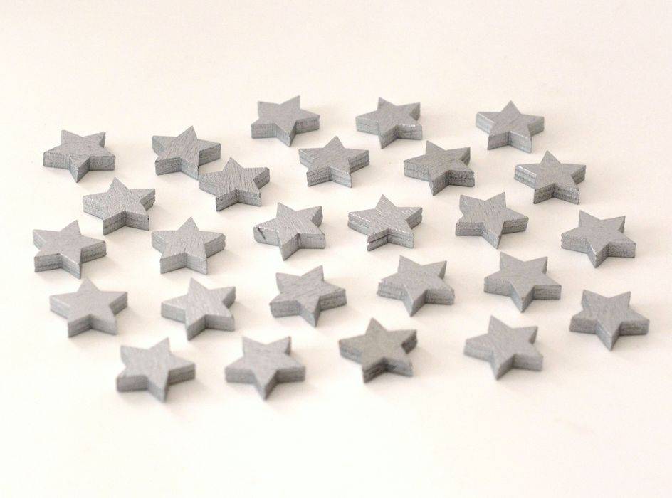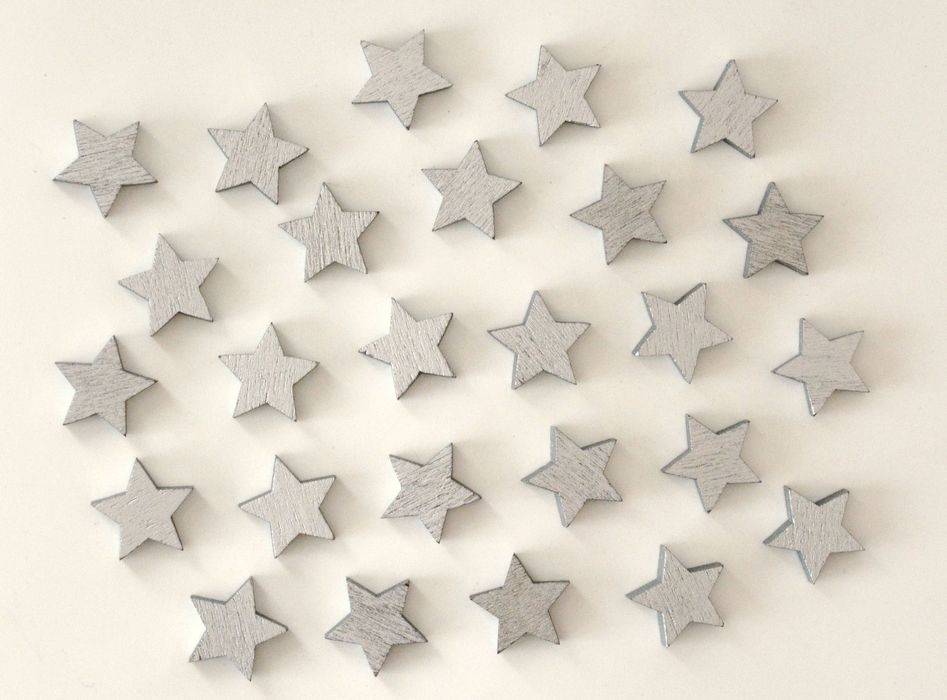Dřevěné stříbrné hvězdičky k dekoracím, aranžování, ... Průměr 20 mm, tloušťka 5 mm. Barva stříbrná. Cena za 1 ks.