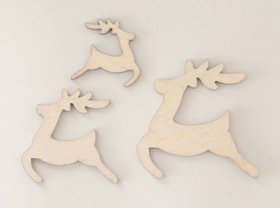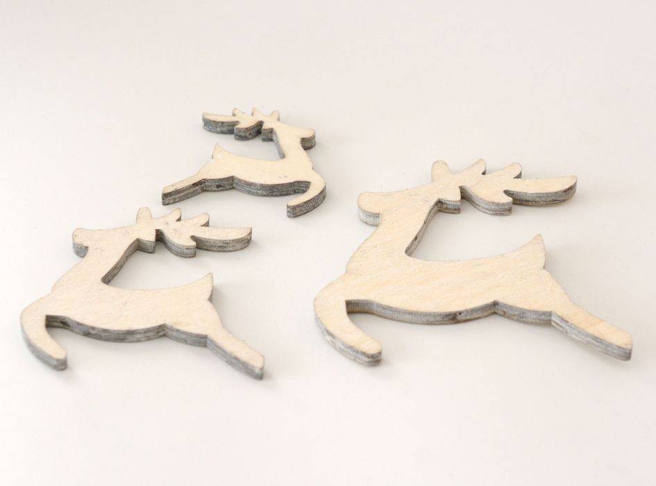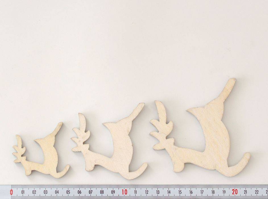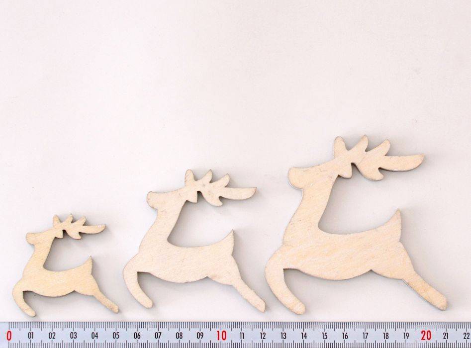 Dřevěné dekorace - výseky jelena v přírodní barvě a různých velikostech vhodné k dekoracím, aranžování, zdobení přáníček, věnečků, atd... Velikost od 5 do 9 cm. Tloušťka 4 mm. Barva přírodní. Cena za 1 ks.