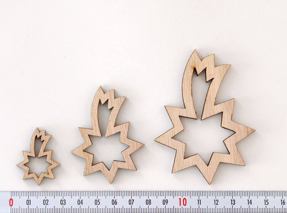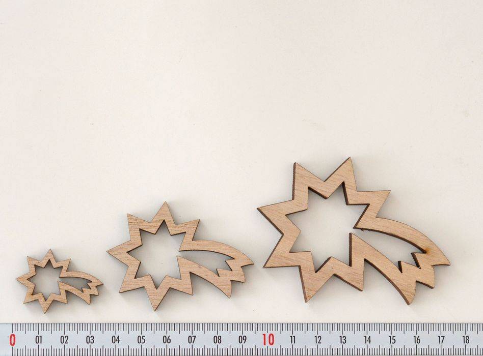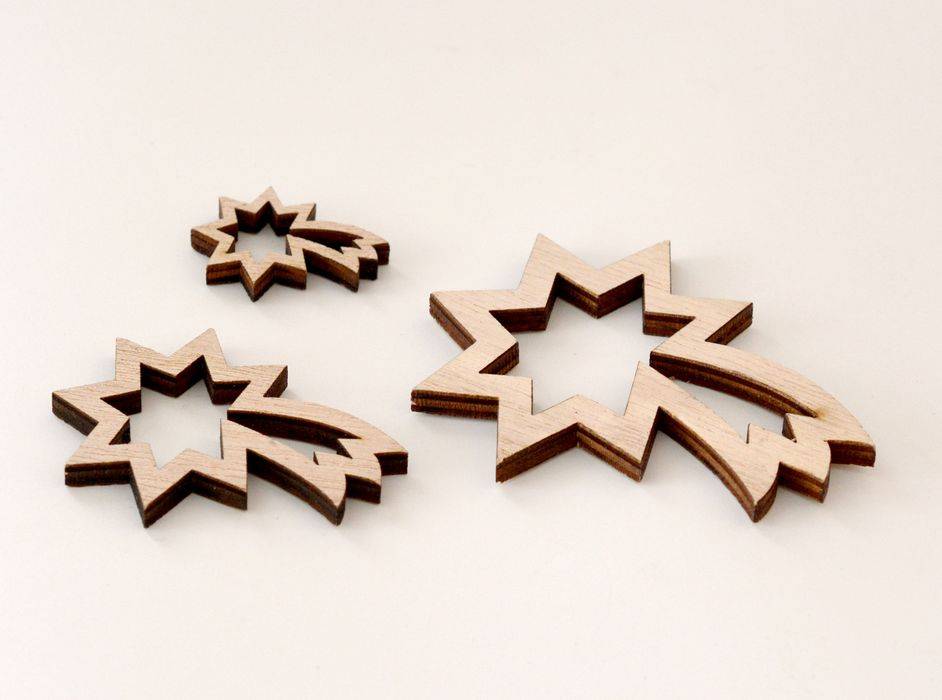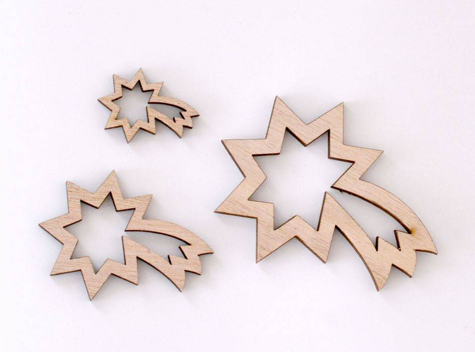 Dřevěné dekorace - výseky komety v různých barvách a velikostech vhodné k dekoracím, aranžování, zdobení přáníček, věnečků, atd... Velikost od 3,5 do 7,5 cm. Tloušťka 5 mm. Barva hnědá. Cena za 1 ks.