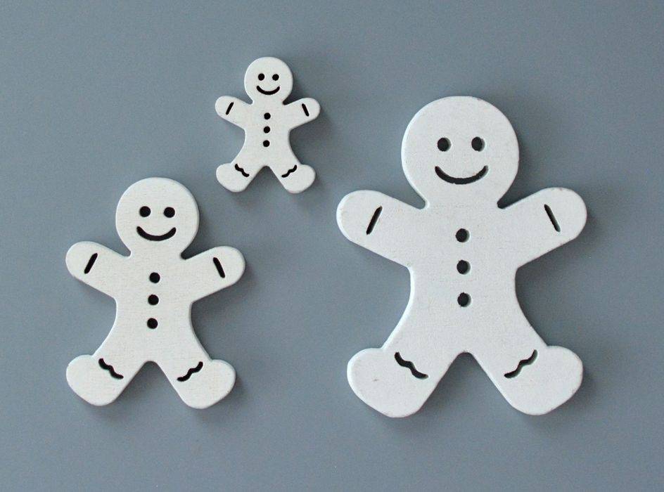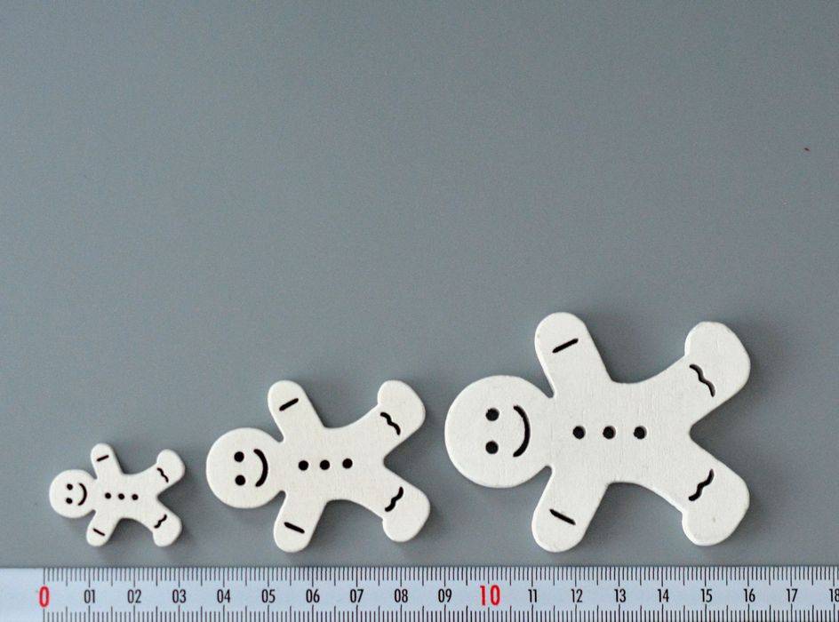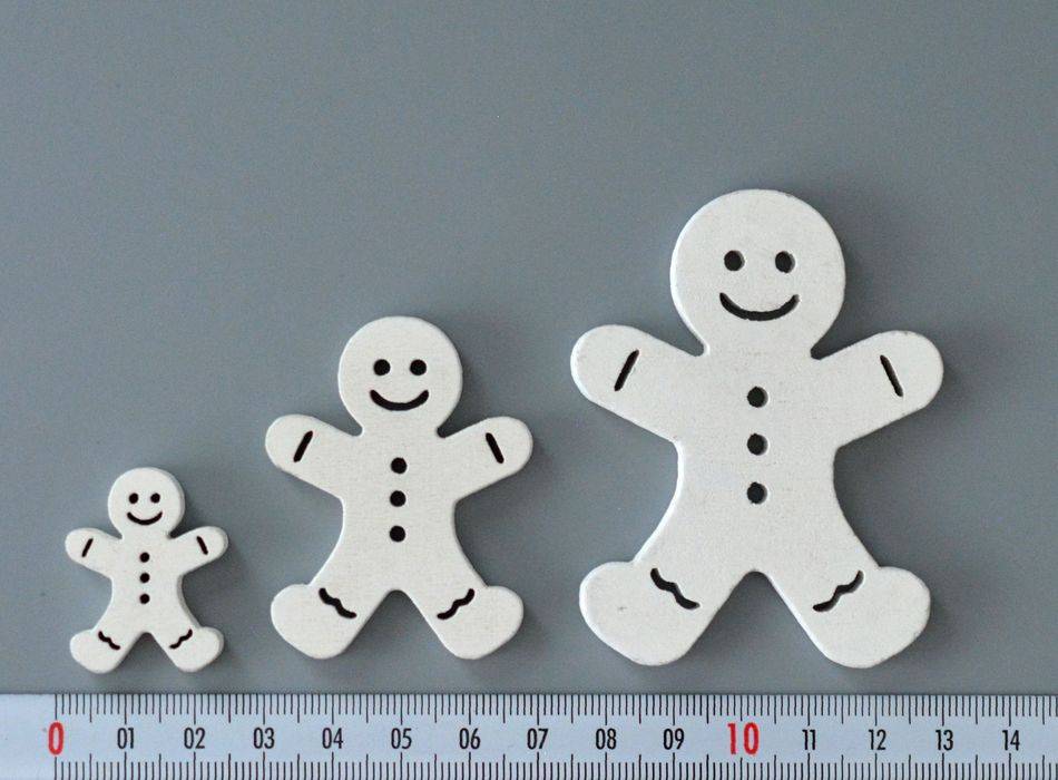 Dřevěné dekorace - výseky panáčka z perníčku v různých barvách a velikostech vhodné k dekoracím, aranžování, zdobení přáníček, věnečků, atd... Velikost od 2 do 7 cm. Tloušťka 5 mm. Barva bílá. Cena za 1 ks.