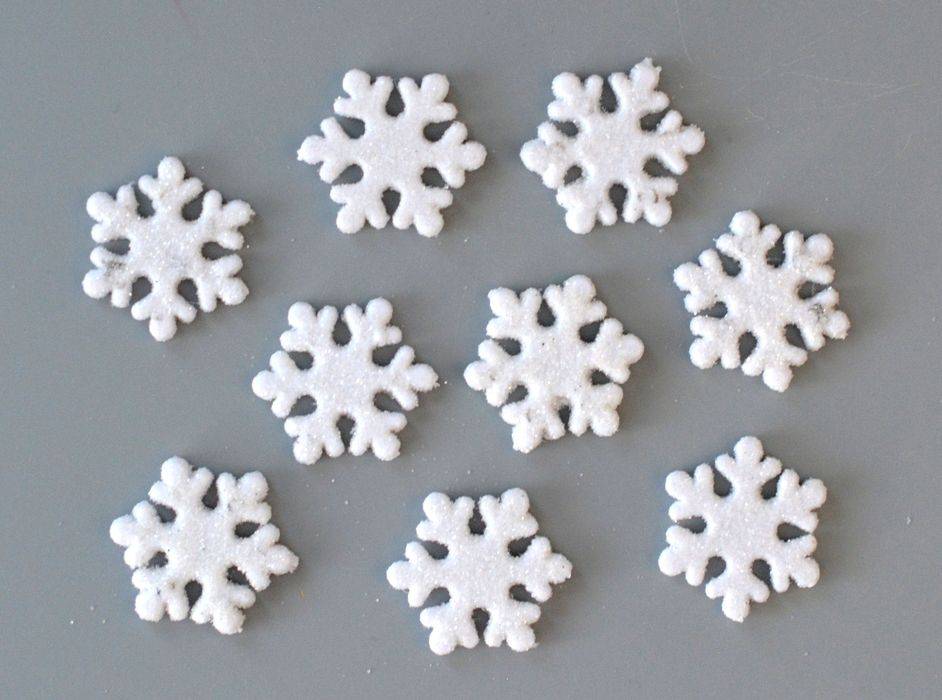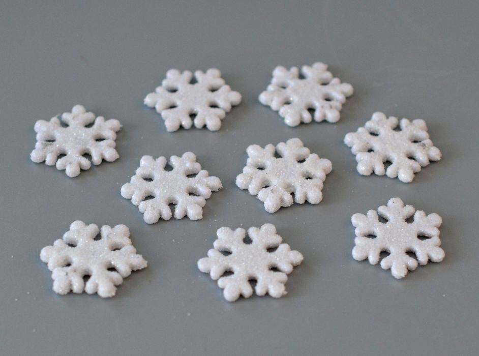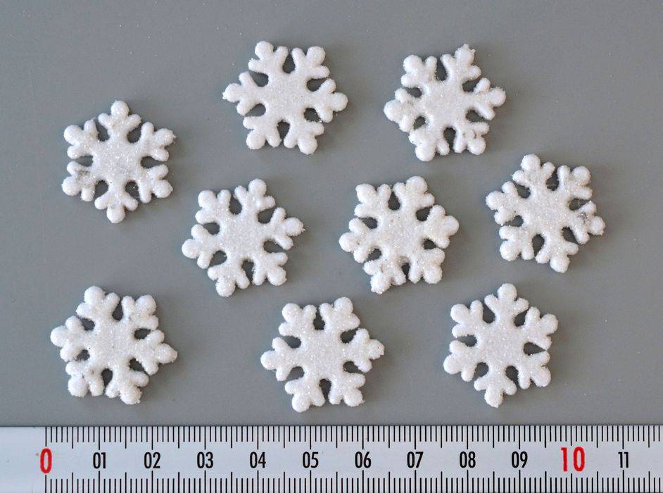 Plastová sněhová vločka s třpytivým bílým povrchem. Vhodná k vánočním dekoracím, zdobení stolů, věnečku, přáníček, a pod. Průměr 2,3 cm. Tloušťka 2 mm. Barva bílá. Balení 24 ks.