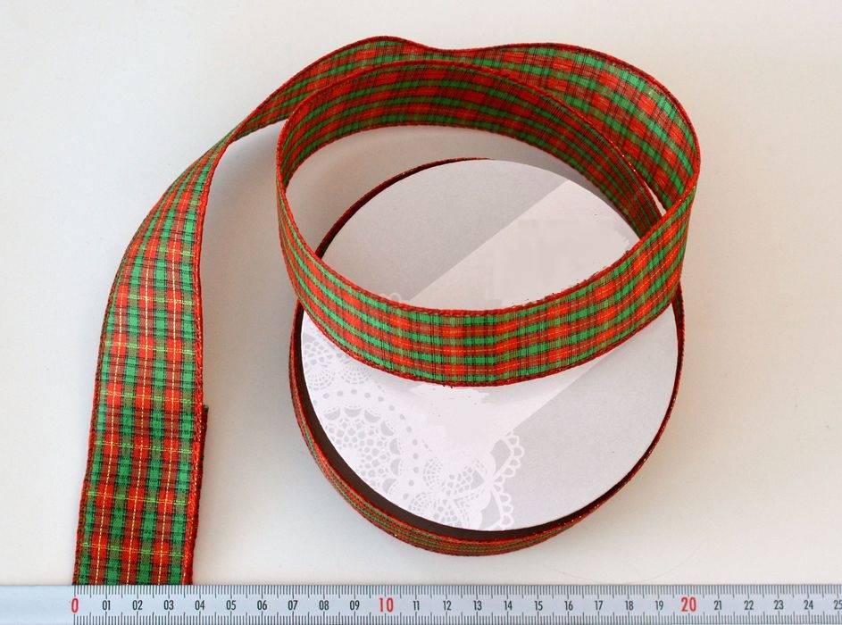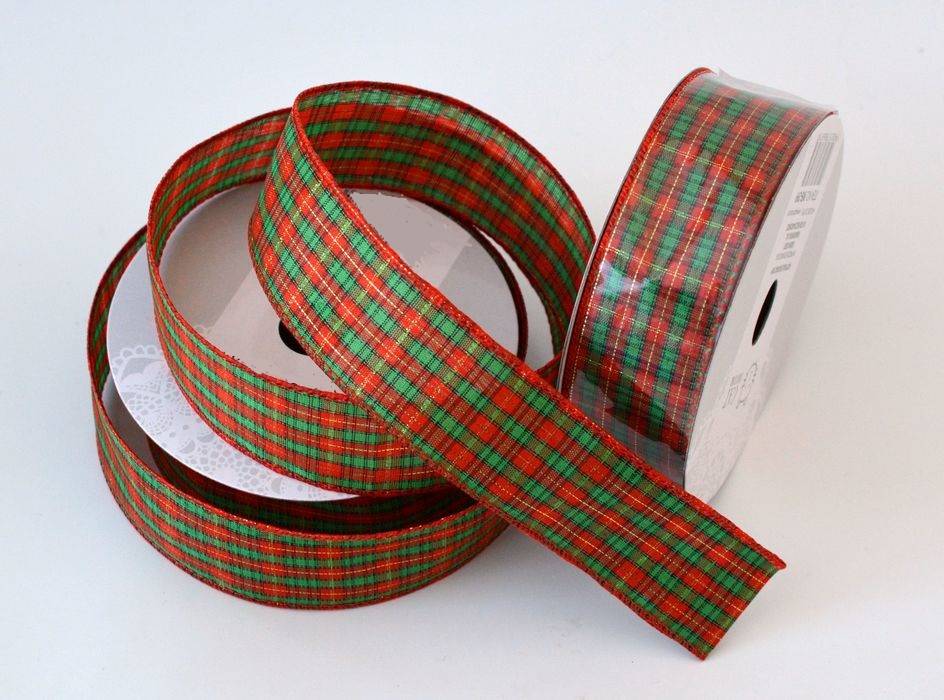 Pevná textilní stuha v červeno-zelené barvě se zlatým zdobením. Stuha je na okrajích vystužená drátky. Šířka 3,8 cm. Stuha je vhodná ke zdobení květinových vazeb, vánočních dekorací, oživení květináčů nebo dekoraci věnců. Bal. 9,14 m.