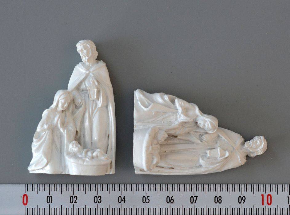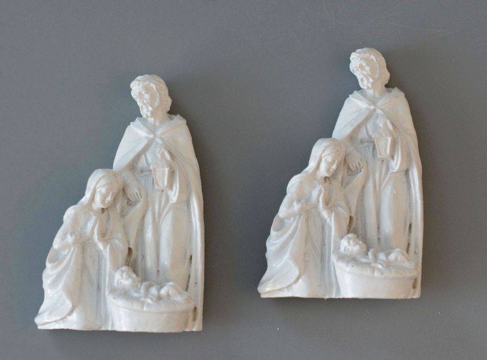 Vánoční ozdoba Svaté rodiny z umělého kamene. Na zadní straně opatřená samolepkou. Rozměry 35 x 55 x 20 mm. Barva bílá. Cena za 1 ks.