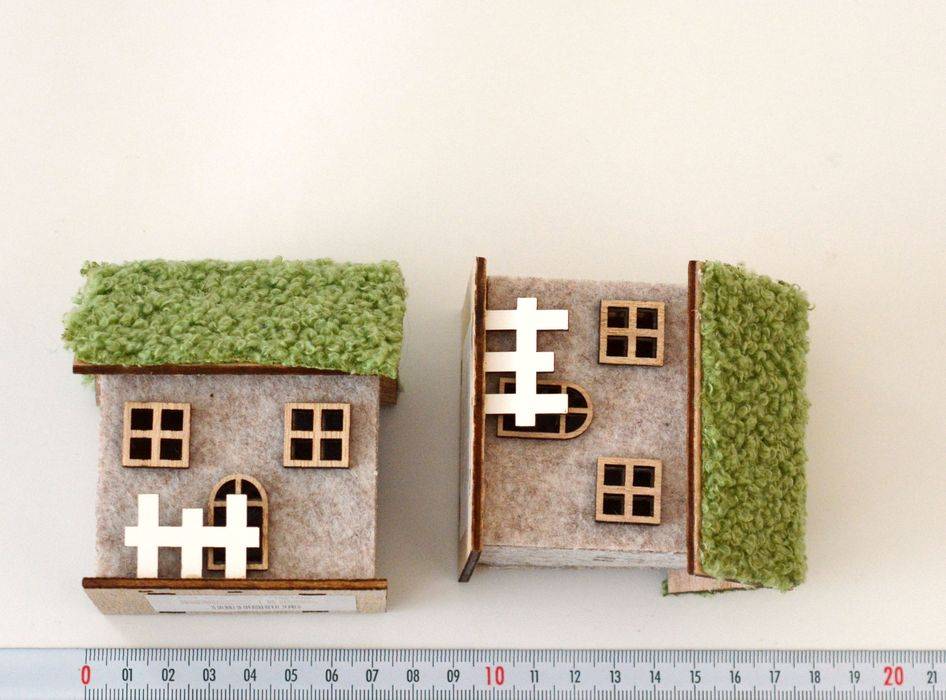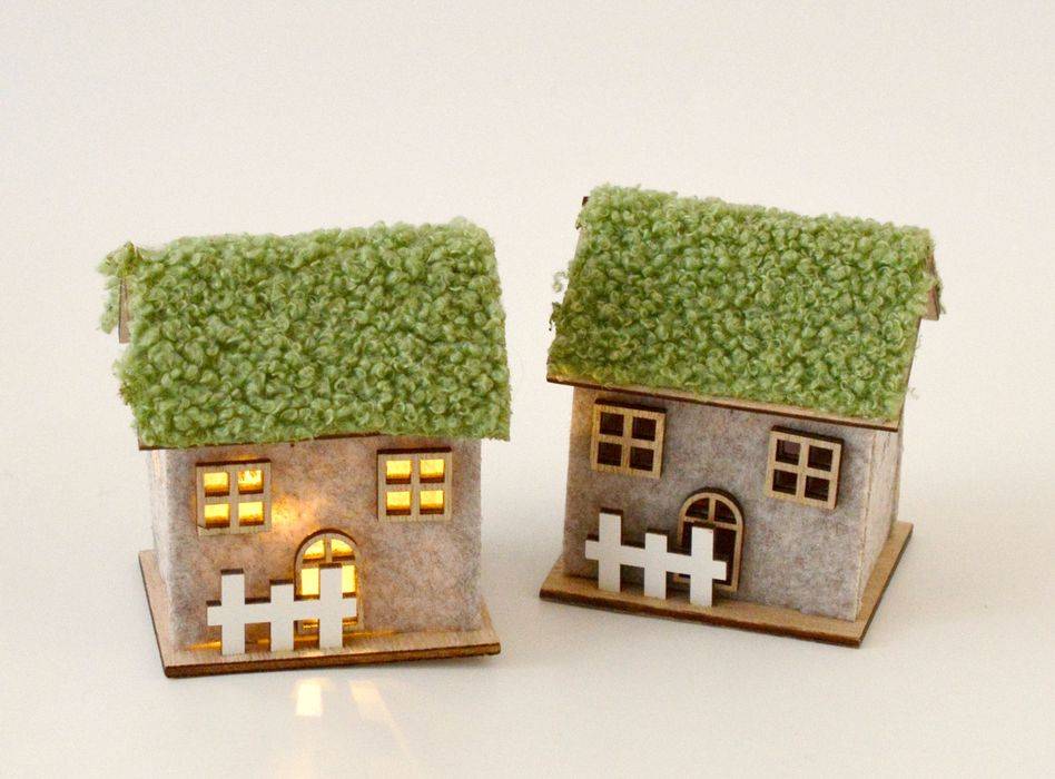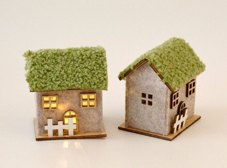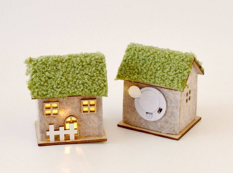 LED lampička v podobě mechové chaloupky se žlutým světlem. Vyrobena je z kombinace dřeva a filcu. Střecha je z umělého mechu. Velikost 7,5 x 6,5 x 8,5 cm. Napájení 1 ks (CR2032) knoflíkovou baterií, které je součástí. Vhodná k celoročním i vánočním dekoracím, aranžování, atd.