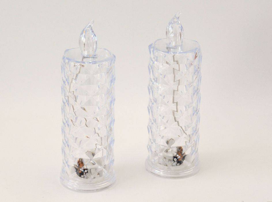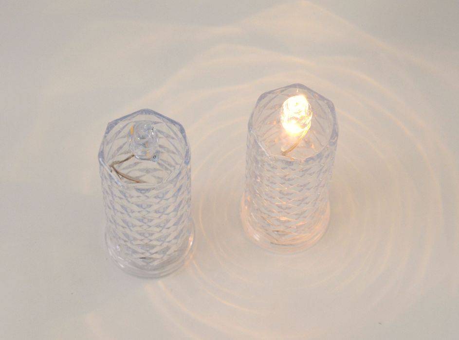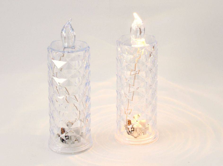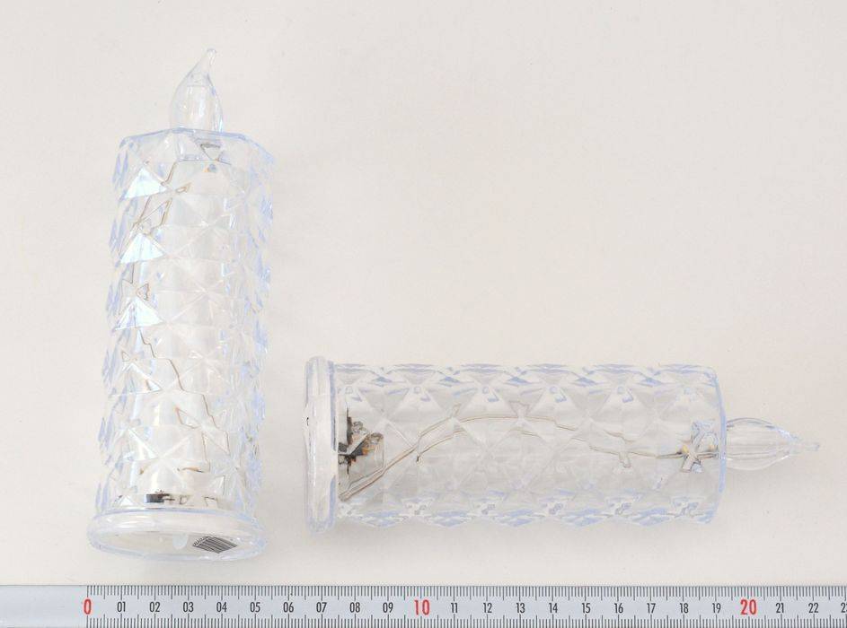 Plastová svítící svíčka s bílým světlem. Barva čirá. Studené světlo. Vhodná pro dekorace, aranžování, ... Průměr 4,5 - 5 cm. Výška 15 cm. Použití na 3 ks baterie AG 10 (LR1130), které jsou součástí.