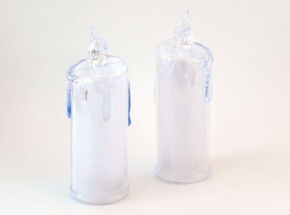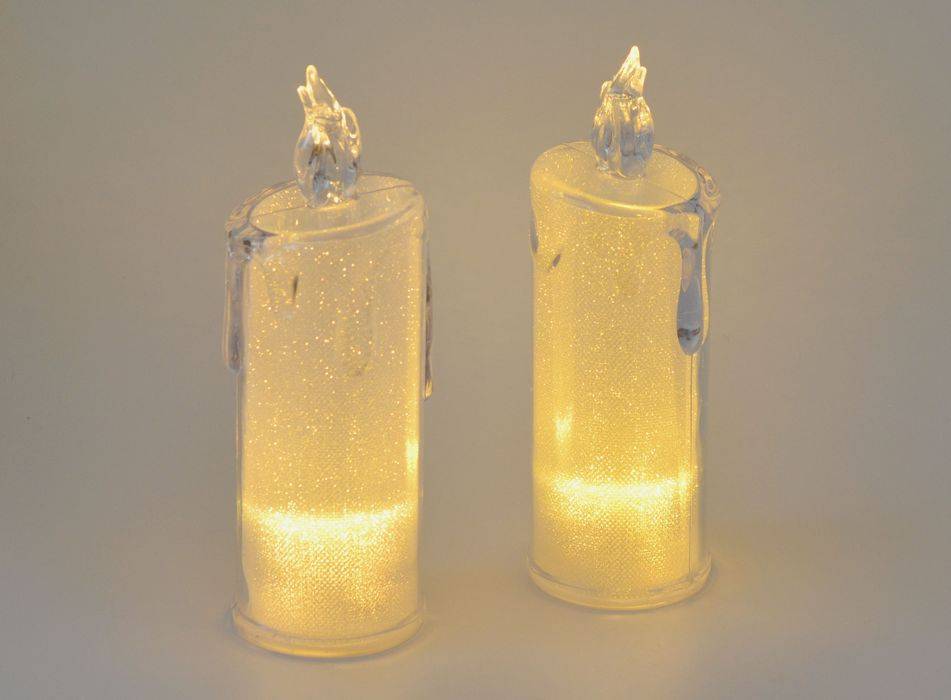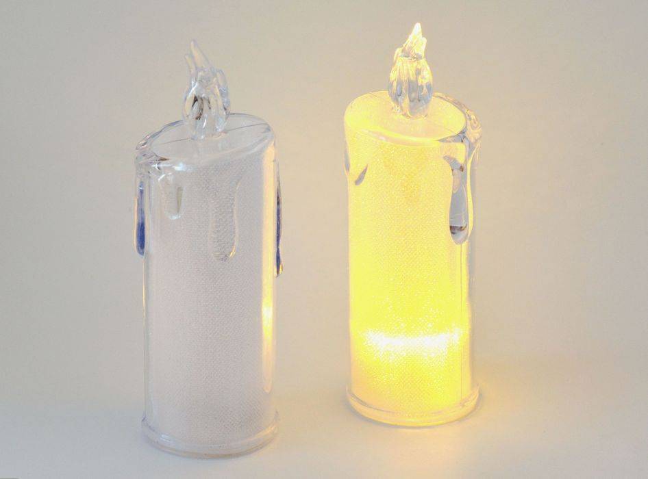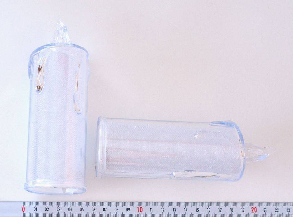 Plastová svítící svíčka se žlutým světlem. Barva čirá. Teplé světlo. Vhodná pro dekorace, aranžování, ... Průměr 5 - 5,5 cm. Výška 15,5 cm. Použití na 3 ks baterie AG 10 (LR1130), které jsou součástí.