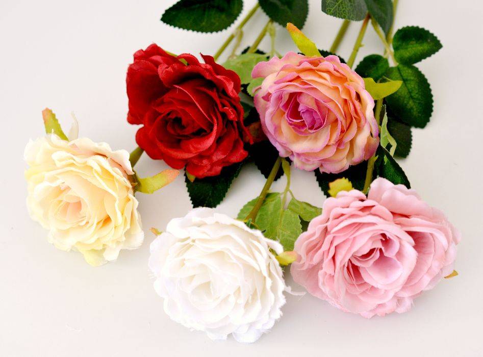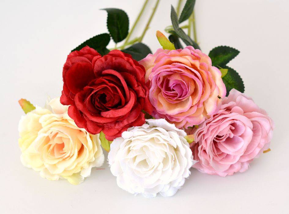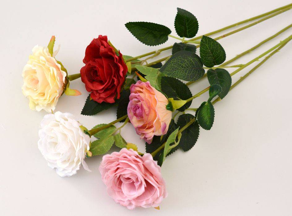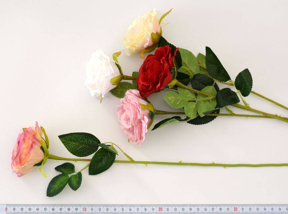 Umělé květy rozkvetlé růže určené k dekoracím, do vázy a aranžování. Průměr květu cca 6 cm, délka cca 50 cm. Více barev. Cena za 1 ks.