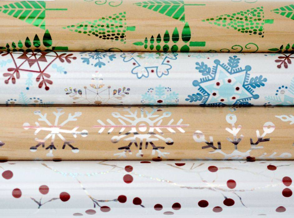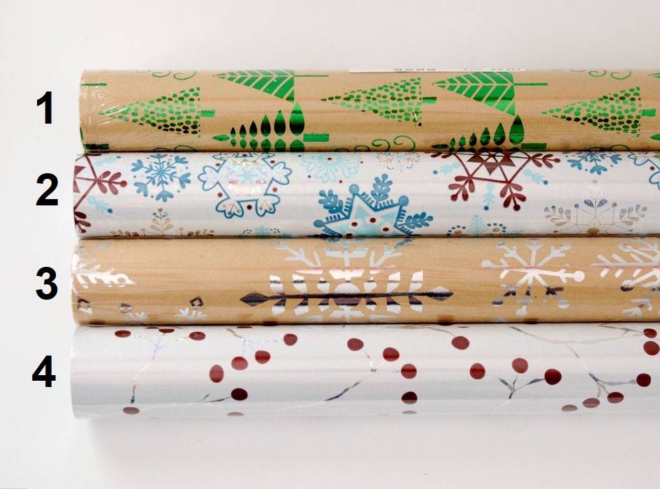 Vánoční balící papír s různými motivy s metalickým vzorem. Role 70 x 150 cm. Na výběr z více motivů. Cena za 1 ks.