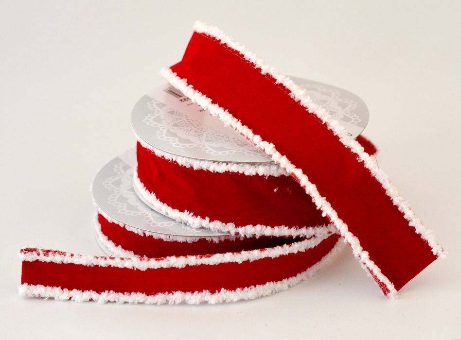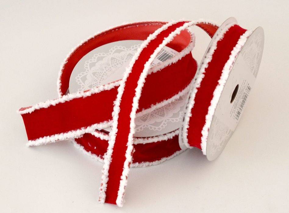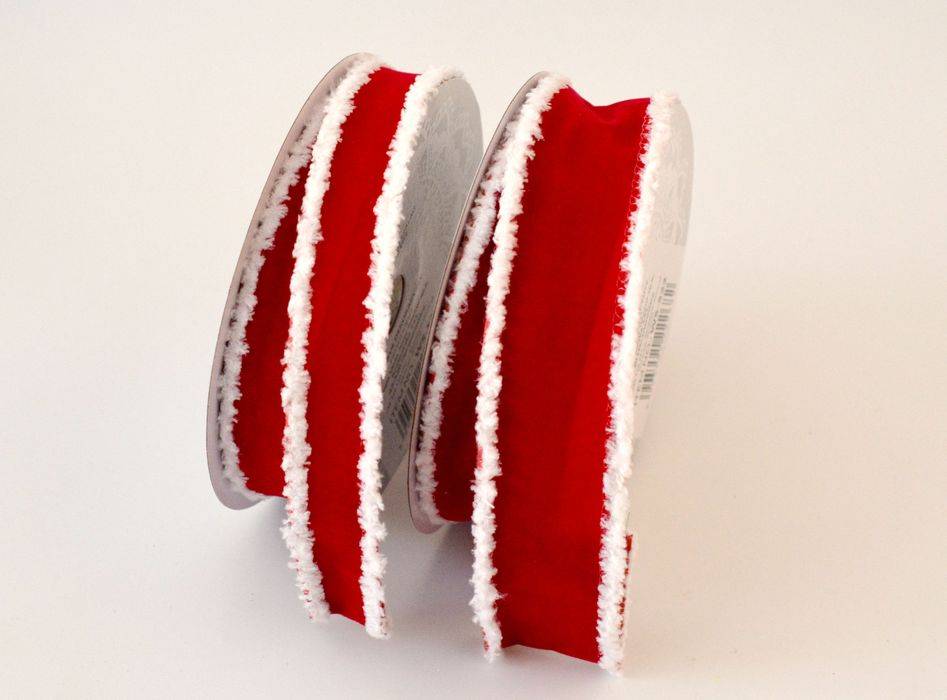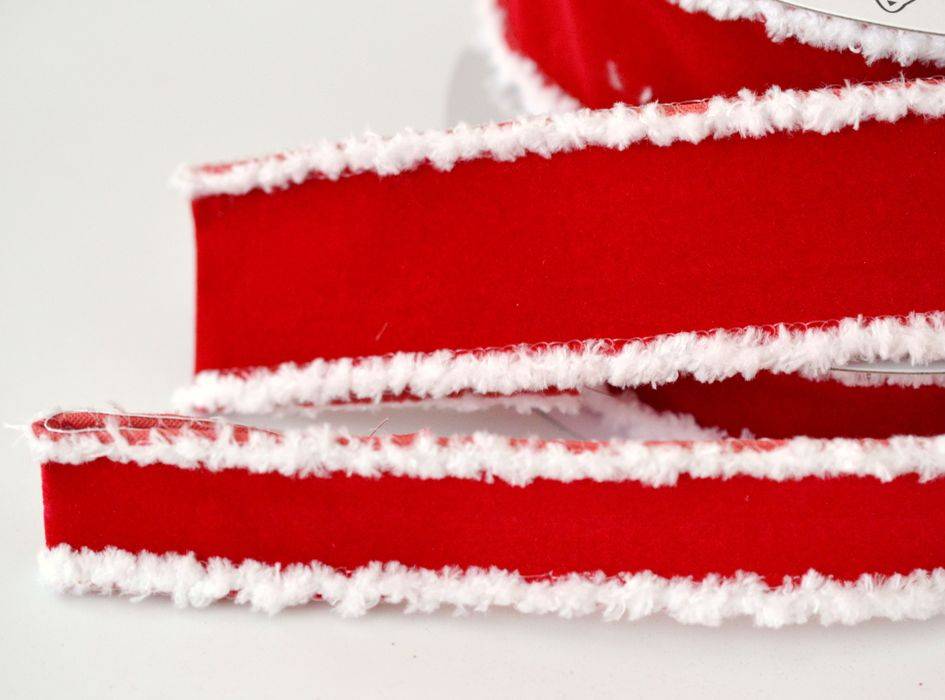 Sametová textilní stuha v červené barvě s bílým lemováním kožešinky. Stuha je na okrajích vystužená drátky. Stuha je vhodná ke zdobení vánočních vazeb, dekorací, oživení květináčů nebo dekoraci věnců. Více rozměrů. Šířka 2,5 cm a 3,8 cm. Délka 9,14 m.