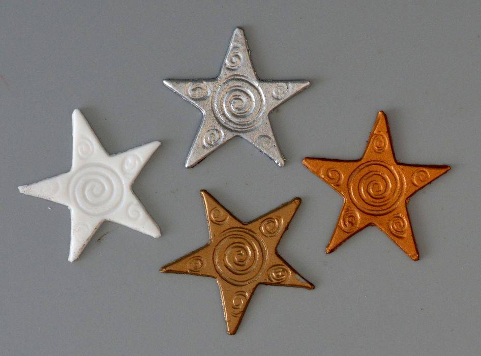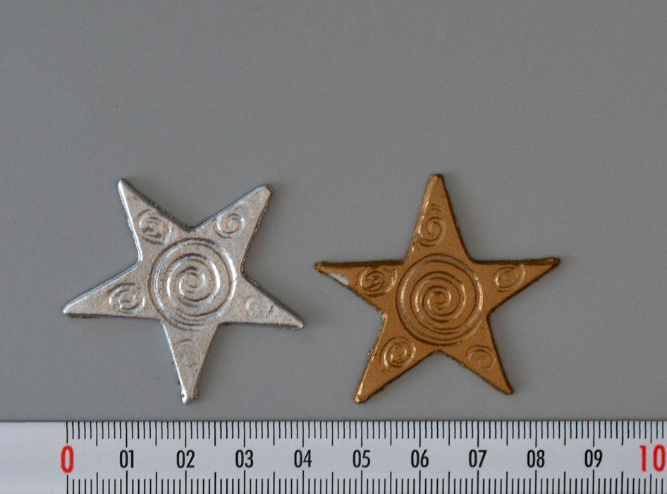 Průměr 40 mm. Nabízíme bílou, stříbrnou, zlatou a bronzovou. Voskovou ozdobu nalepíme na svíčku voskovým lepidlem. V případě kulaté svíčky ji zahřejeme v dlaních a stočíme na požadovaný průměr. Cena za bal. 4 ks.