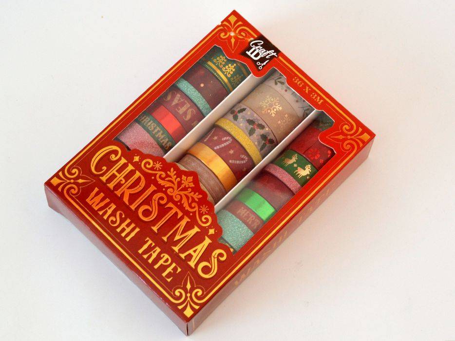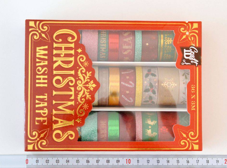 Vánoční Washi ozdobná dekorační páska vhodná na všechny povrchy. Je vyrobena z rýžového papíru a je možné na ni psát. Vhodná ke kolážím, scrapbookingu, na dekoraci, zdobení předmětů, skel, svícnů, rámečků, svíček, atd. Šířka 5 - 20 mm, délka 3 m. Sada 36 ks v papírové krabičce. Balení 36 ks různých barev, šířek a vzorů.