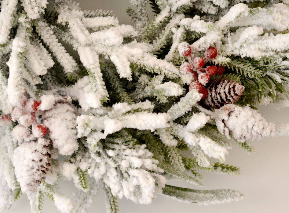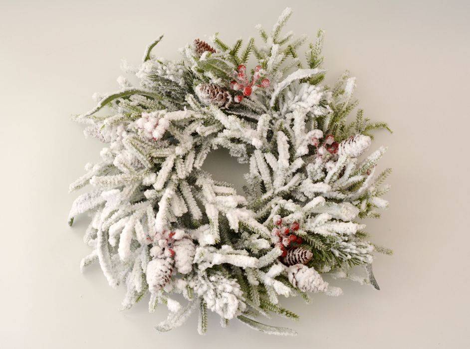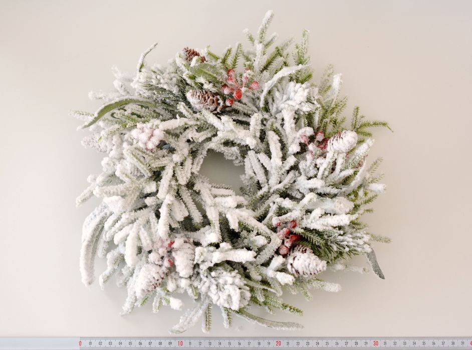 Umělý věnec z jehličí, šišek a plody červených jeřabin zasněžený umělým sněhem určený k dozdobení. Průměr 30 cm. Cena za 1 ks.